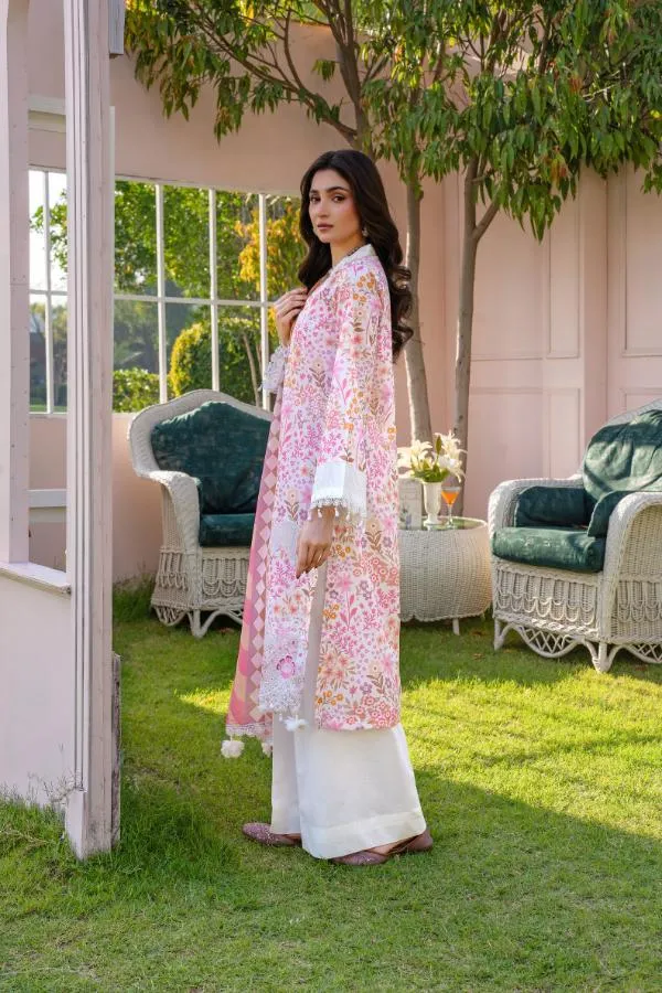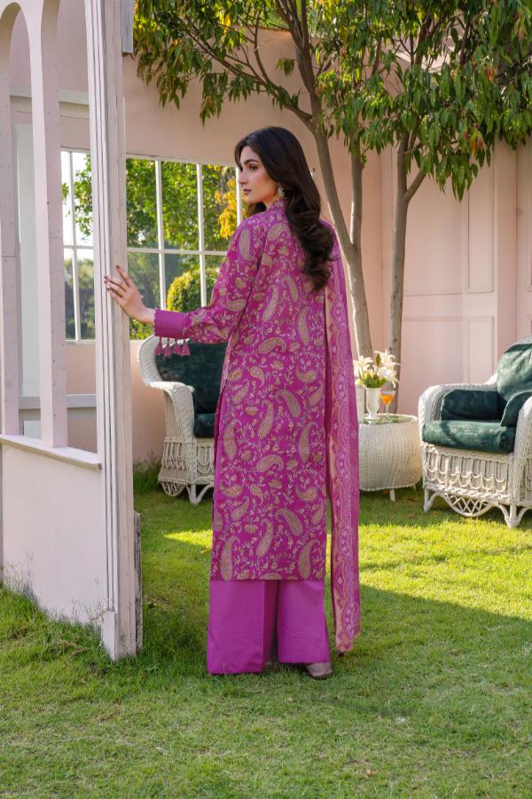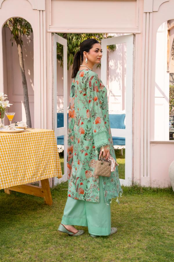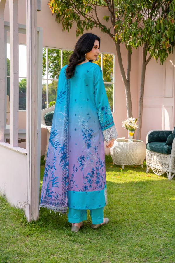 Premium Digital print lawn Embroidered Daman Front Premium Digital print lawn Back Premium Digital print lawn Sleeves Premium Digital print Voil Duppatta Premium Dyed Cotton Trouser